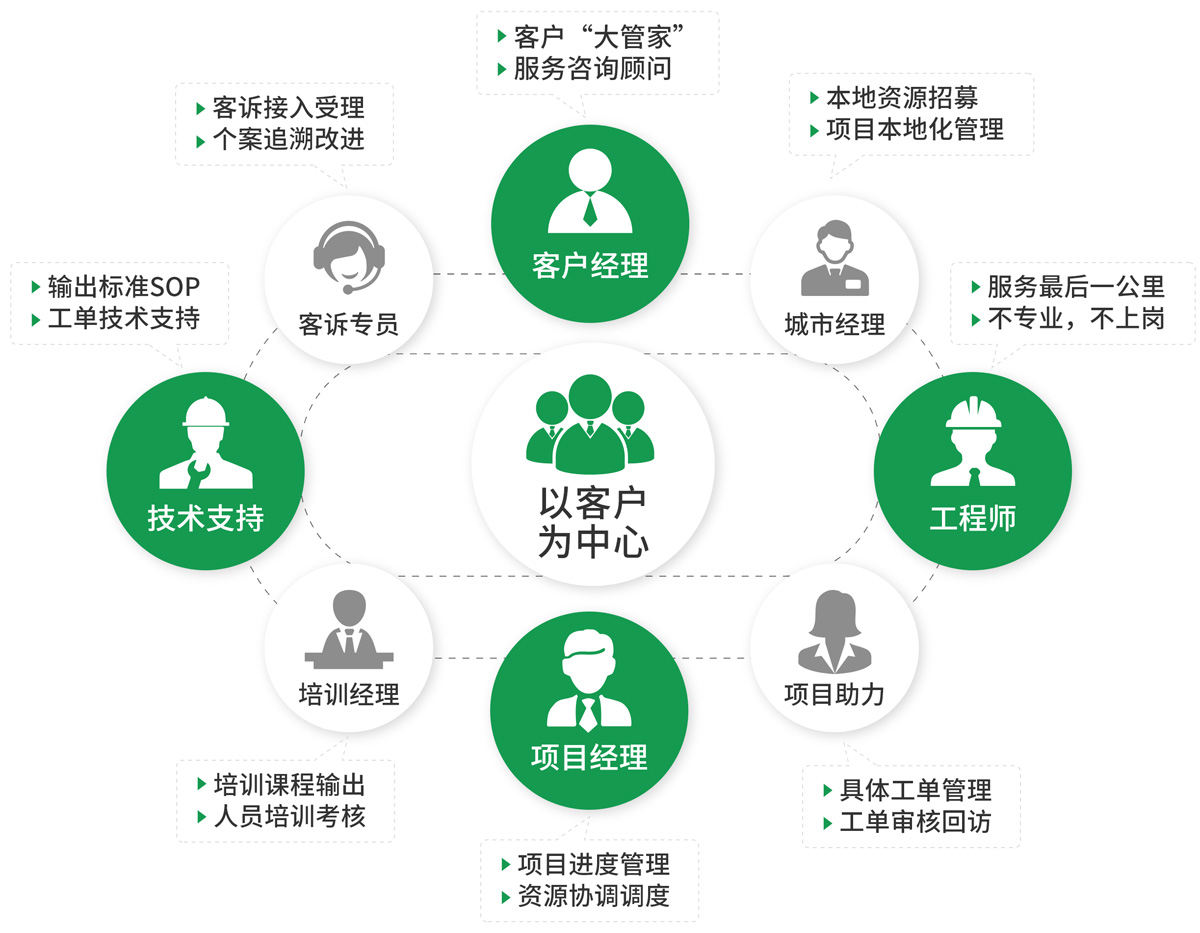 6000+大专以上学历自营工程师,70000+加盟工程师、覆盖全国940+服务站,县级城市覆盖100%,乡镇郊区覆盖90%。